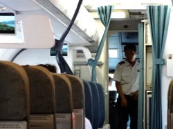 | 機長?もリラックスしてうろうろ?? | 座席からコックピットが見えます |