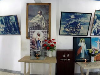 1階の内部はキリストの画像が展示されています。窓からは、登ってきた階段が見えます。