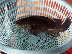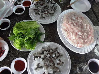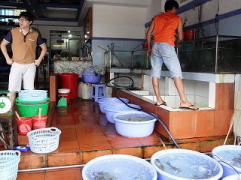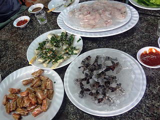レストランの前にはタライの中に新鮮な魚介類が沢山います。